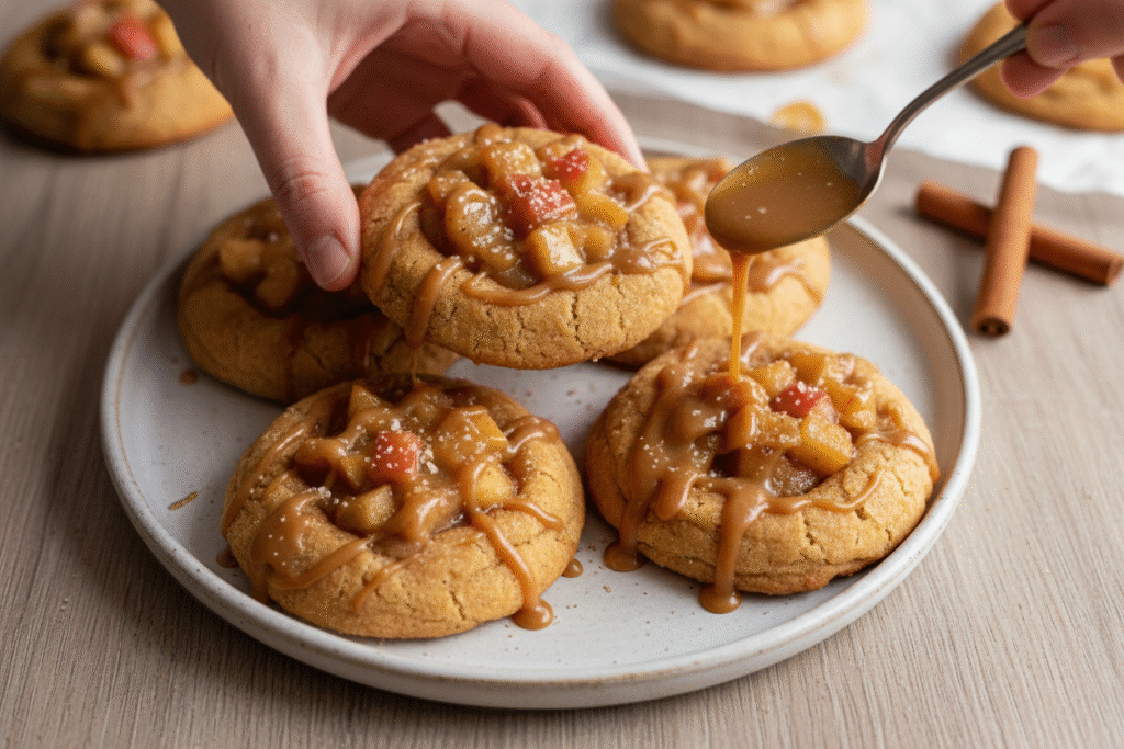Step 5: Finally, the best part: assembly. Spoon the cool apple filling into each cookie’s nest. Drizzle that gorgeous caramel over the top. And there you have it. A cookie that tastes like a slice of home. Serve them right away. The mix of warm cookie, spiced apples, and sweet caramel is pure joy. I hope you love them as much as I do.