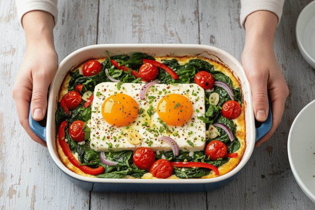 Step 1: Heat your oven to 400°F. Grab your favorite baking dish. Toss in the tomatoes, bell pepper, onion, and garlic. Now, place the whole block of feta right in the middle. Drizzle everything with lovely olive oil. I still laugh at that time I used the fancy dish. It was far too small! Step 2: Sprinkle all your herbs and spices over everything. Be generous with that black pepper! Pop the dish into the hot oven. Bake it for about 25 minutes. You’ll know it’s ready when the feta looks golden. The tomatoes will be bursting with juice. Step 3: Carefully take the dish out. The oven is hot! Stir everything together. The feta will melt into the veggies. Now, mix in your fresh spinach. It wilts perfectly in the warm mixture. (My hard-learned tip: always use a potholder. That dish handle gets very hot!) Step 4: Make four little holes in the mix. Crack an egg into each well. Try to keep the yolk whole. It makes for the best, sunny dip later. Do you like your egg yolks runny or fully set? Share below! Step 5: Bake it again for about 10 more minutes. Watch until the egg whites are just set. I like my yolks still a bit wobbly. Then, sprinkle on some fresh herbs if you have them. Your kitchen will smell incredible. Time to eat! Cook Time: 35 minutesTotal Time: 45 minutes