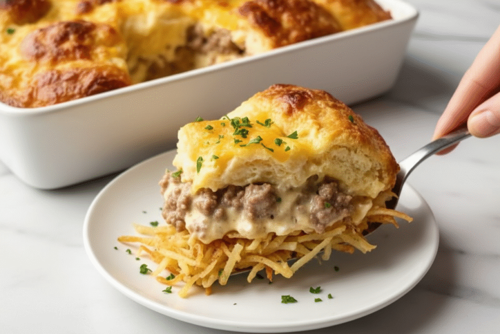 Biscuits and Gravy Hashbrown Breakfast Casserole