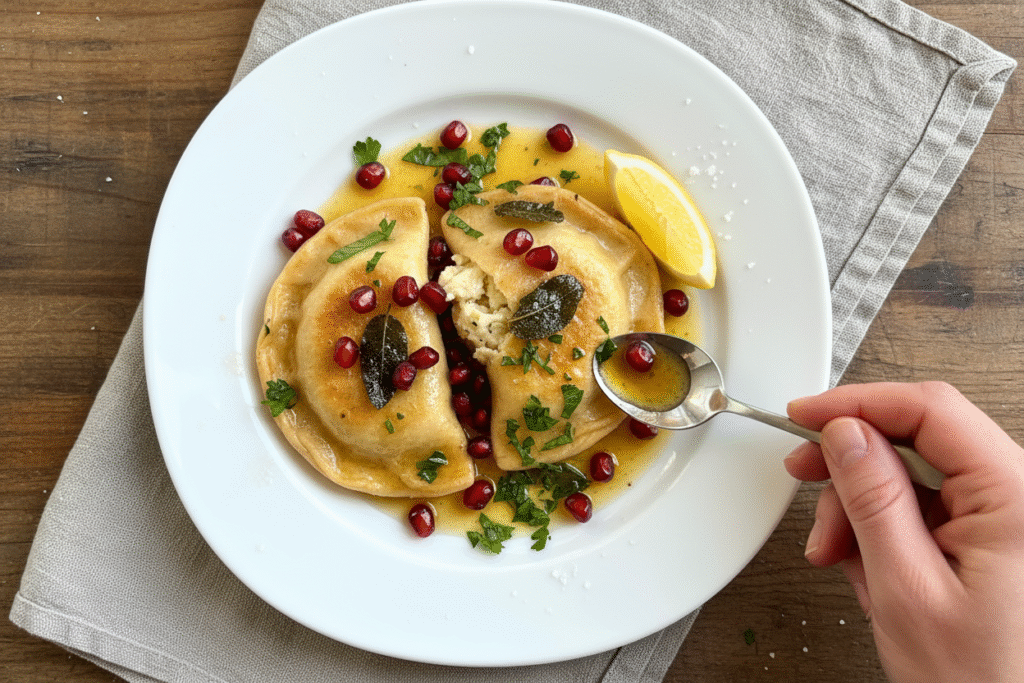 Time to plate! Put your pierogies on a big platter. Spoon that glorious brown butter right over them. Then, scatter the bright red and green gremolata on top. You must eat them right away. The mix of warm, crispy, and fresh is pure joy.