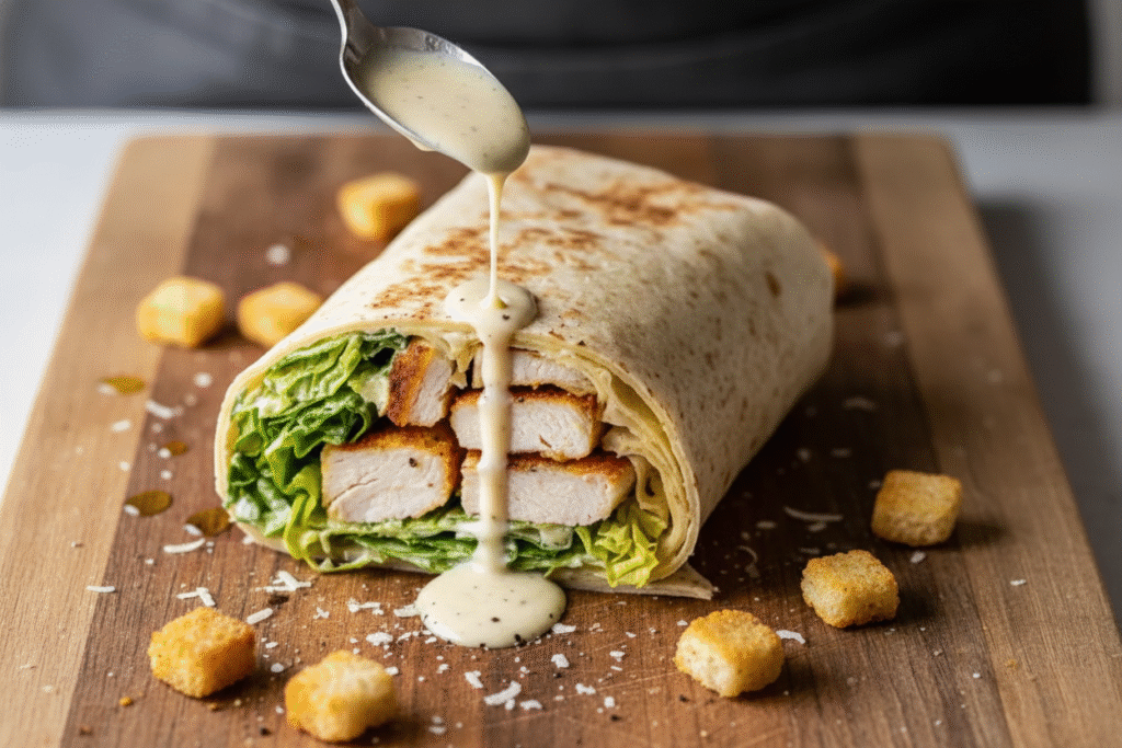 - Assemble the wrap: Lay a tortilla flat on a clean surface. Spoon half of the chicken Caesar mixture into the center. Add croutons and a dash of black pepper, if desired.