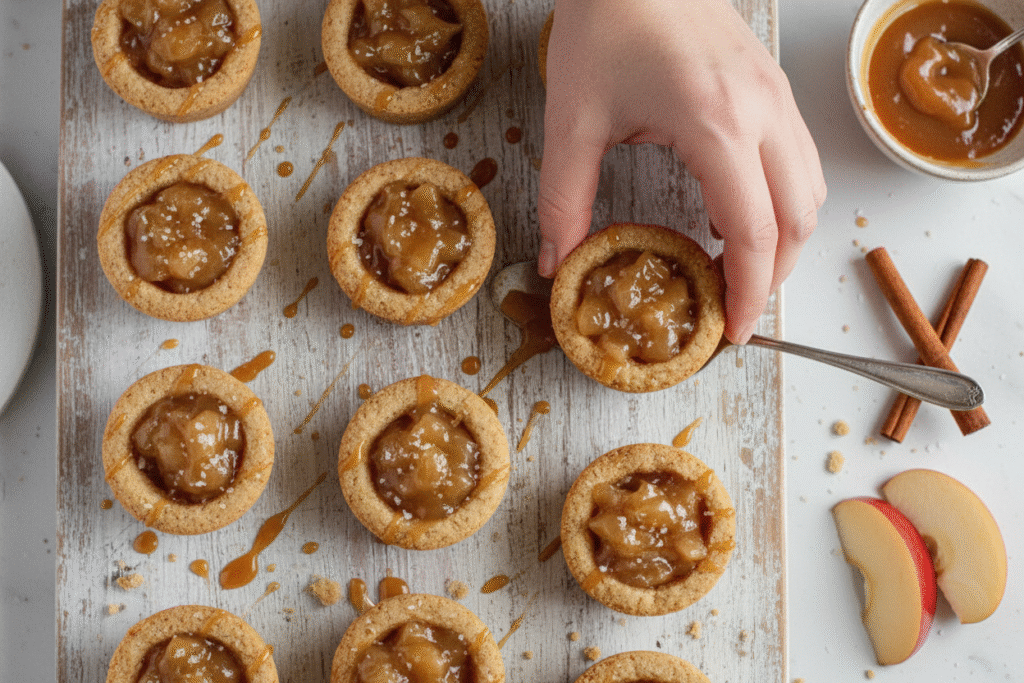 - Step 5: Chop the apple pie filling a bit if the chunks are big. I use kitchen scissors right in the can. Fill each cookie cup. Drizzle with salted caramel. A tiny pinch of flaky salt on top is magic. And there you have it!