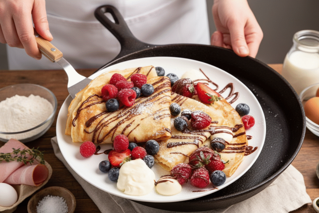 For a sweet treat, I love whipped cream and berries. A drizzle of chocolate is pure joy. For savory, try ham and grated cheese. Fold it like a little envelope.