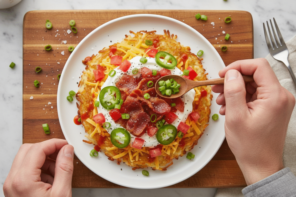This is the fun part. Take your cheesy, crispy hashbrown round to the table. Let everyone see it. Then bring out the toppings in little bowls. It’s like a party for your plate. Bacon, green onions, tomatoes, sour cream.