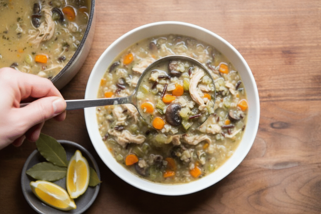After the veggies are soft, the rest is easy. You just add everything in. The chicken, the wild rice, the stock. Don’t forget the rosemary and bay leaves. They are like quiet little songs in the pot.