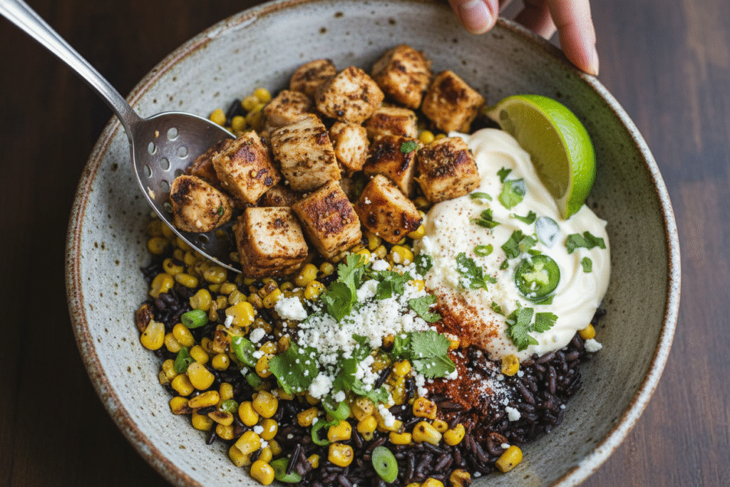 Creamy, tangy street corn meets juicy chicken in this easy, flavor-packed rice bowl. A quick, satisfying meal with a smoky kick!